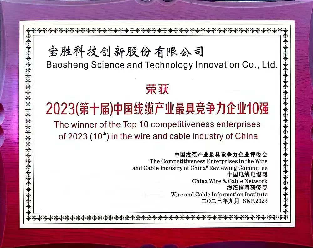連續十年!寶勝股份榮獲“2023年度中國線纜產業最具競爭力企業10強”