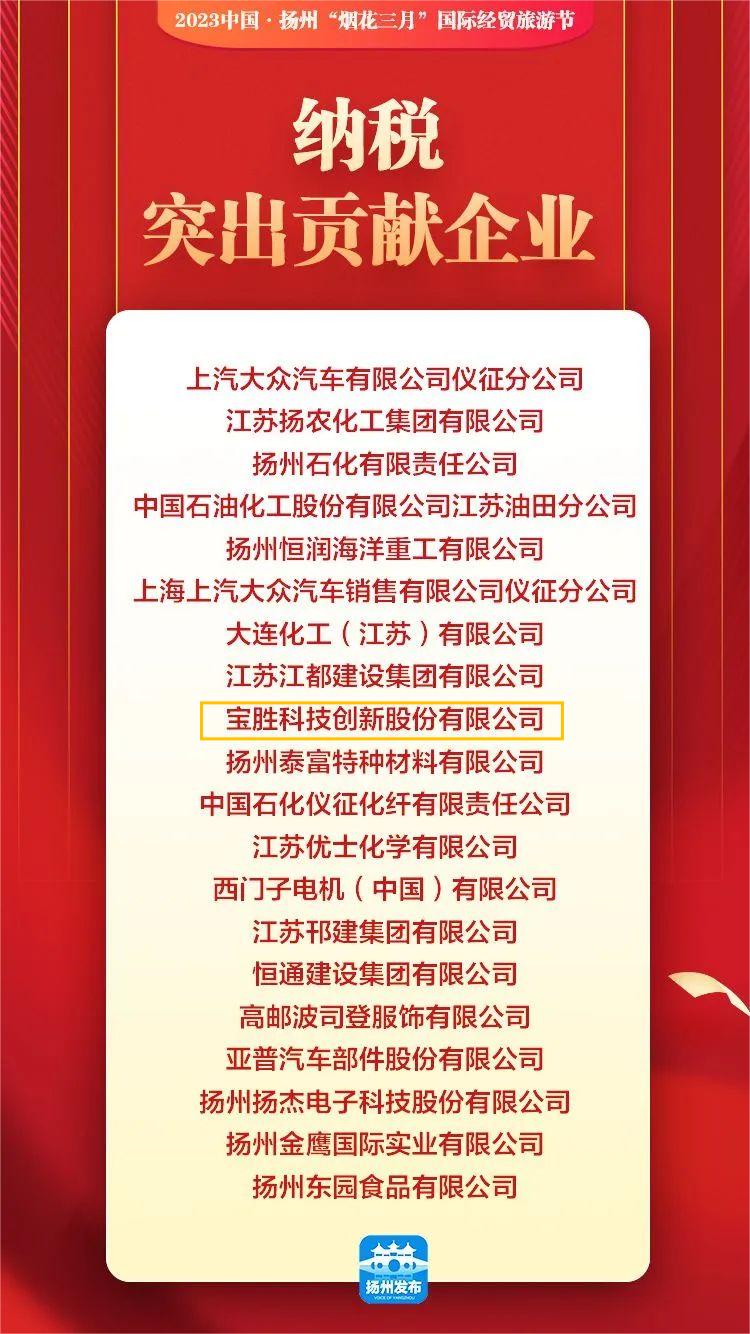 此次評選對象為揚州市符合產業政策、發展前景良好、稅收貢獻突出的工業、服務業、建筑業、農業企業。評選對象企業由各行業主管部門擇優推薦,原則上以納稅貢獻為主,綜合考慮企業稅收貢獻率、納稅增長率、社會影響力,并兼顧行業均衡。在上榜的20家企業中,寶勝股份是全市唯一一家獲此殊榮的線纜企業。