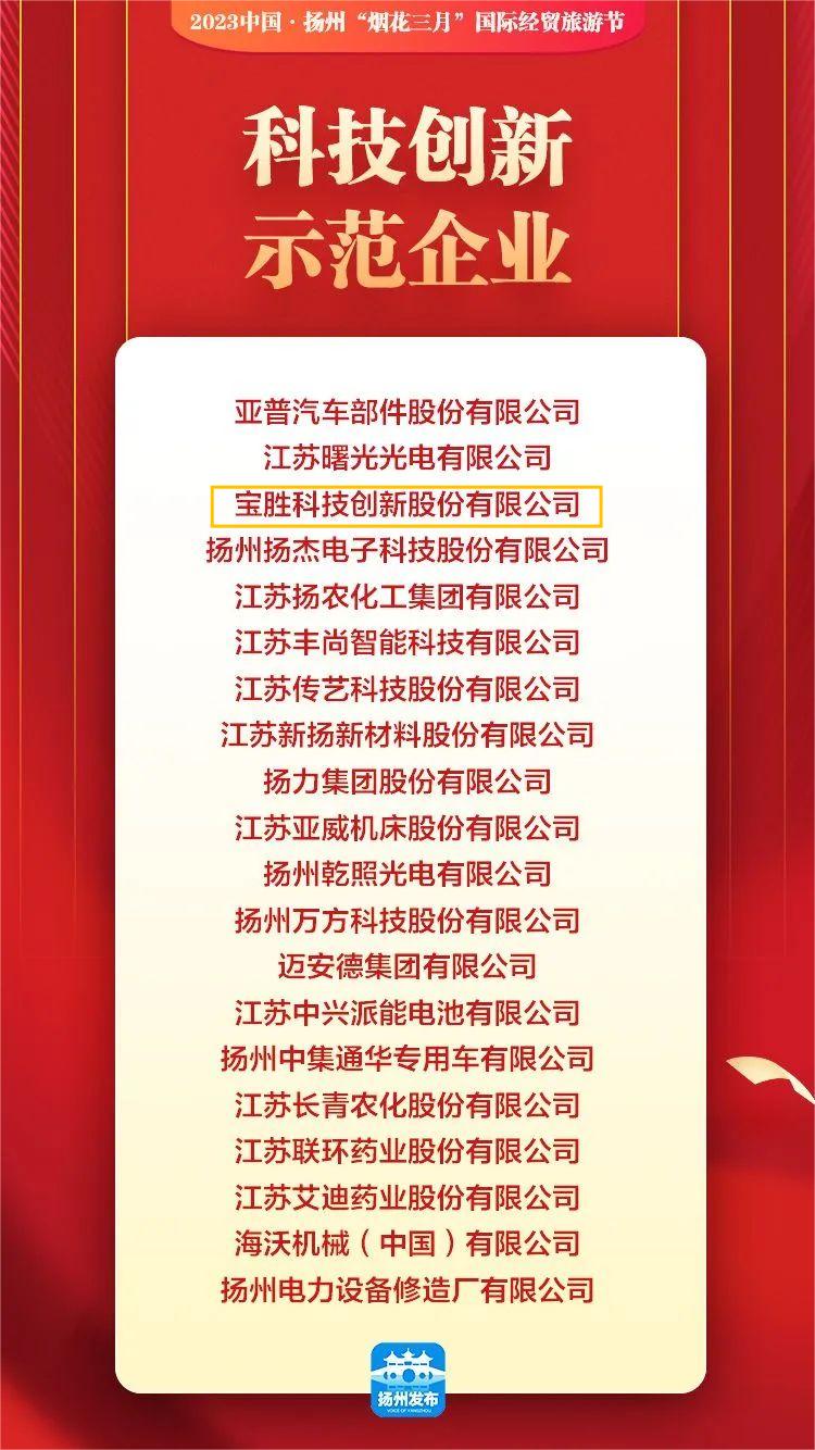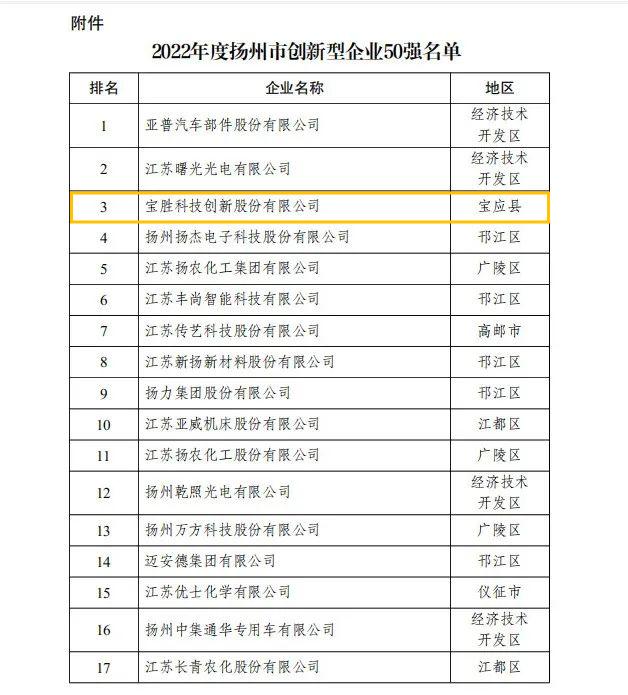 與此同時,揚州于近日組織開展了全市高新技術企業創新能力評價研究,經專家評估、信用審查等程序,寶勝股份入選“2022年度揚州市創新型企業50強”榜單。