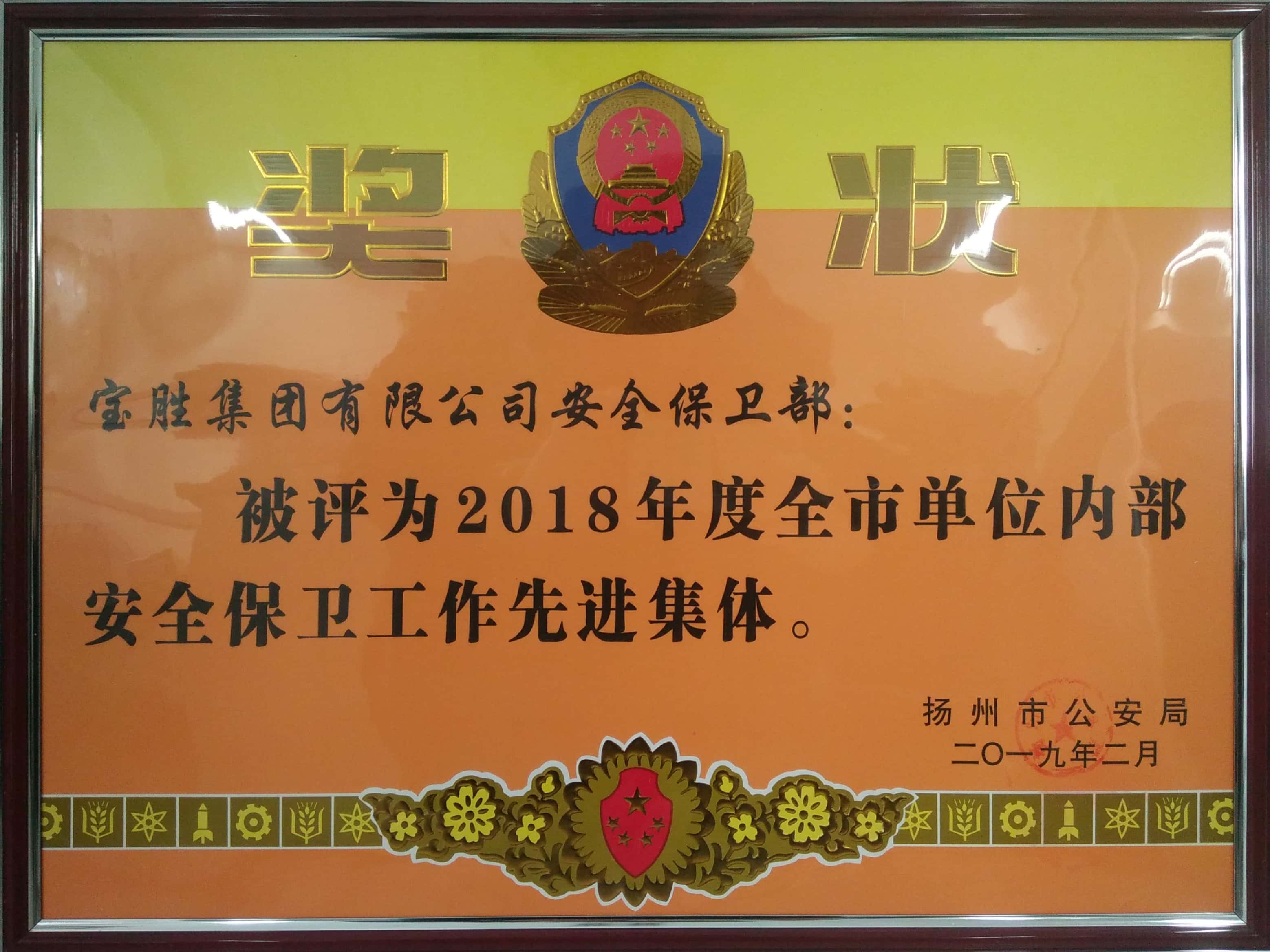 近日,寶勝集團收到揚州市公安局文件,寶勝集團安全保衛部被評為“2018年度全市單位內部安全保衛工作先進集體”榮譽稱號。
