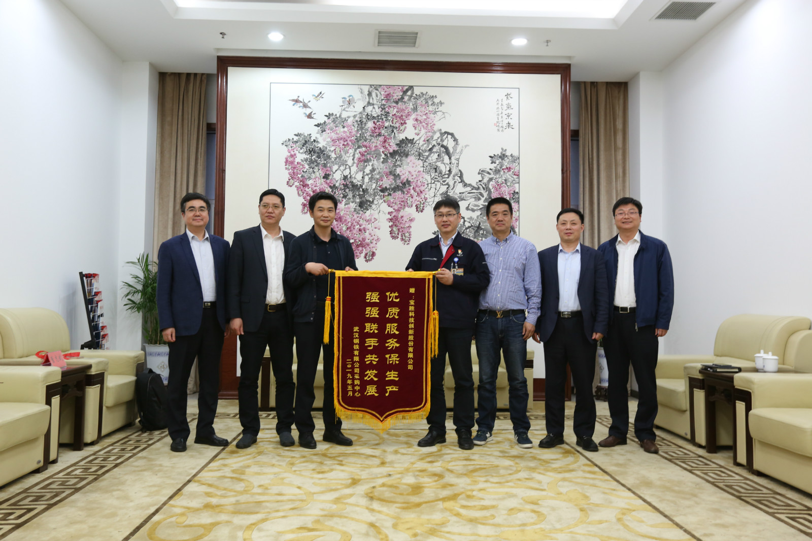 近日,武漢鋼鐵采購中心副總經理韓道旺、采購部長董志武將題有“優質服務保生產,強強聯手共發展”的錦旗送到了寶勝集團,對寶勝在武鋼項目建設過程中所給予的“真誠、高效、快捷”的服務表示衷心感謝。寶勝集團董事長楊澤元,寶勝股份副總裁夏成軍、生長山、唐愛華等參加座談交流。