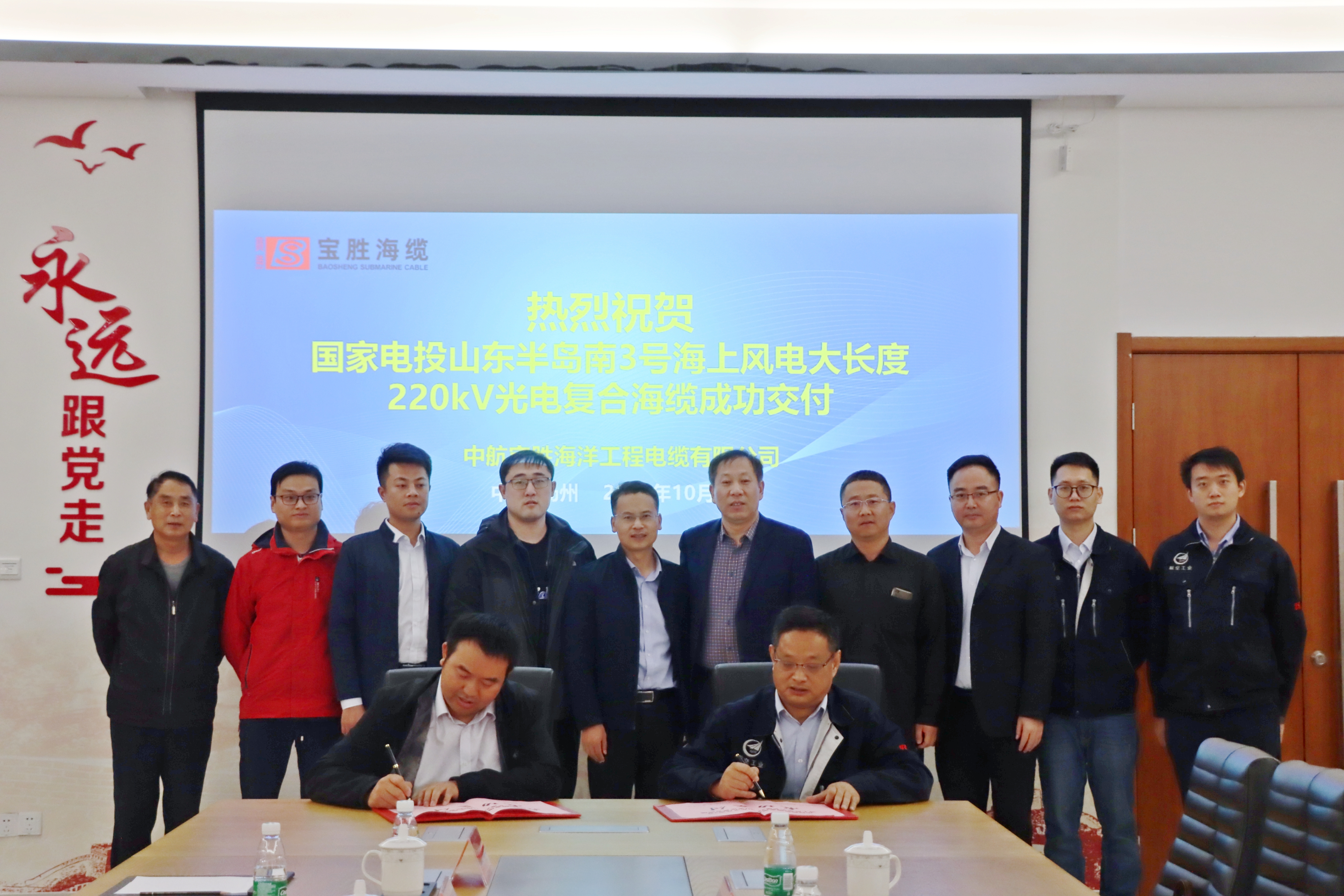 國家電投集團山東分公司副總經(jīng)理劉毅、國家電投集團海陽海上風電有限公司總經(jīng)理助理羅朝發(fā)、部門經(jīng)理王文奇,寶勝股份副總裁、中航寶勝海洋工程電纜有限公司董事長陳大勇、執(zhí)行總經(jīng)理趙文明等參加了活動。寶勝海纜副總經(jīng)理朱志德、國家電投集團海陽海上風電有限公司總經(jīng)理助理羅朝發(fā)分別代表雙方簽署了海纜交付文件。