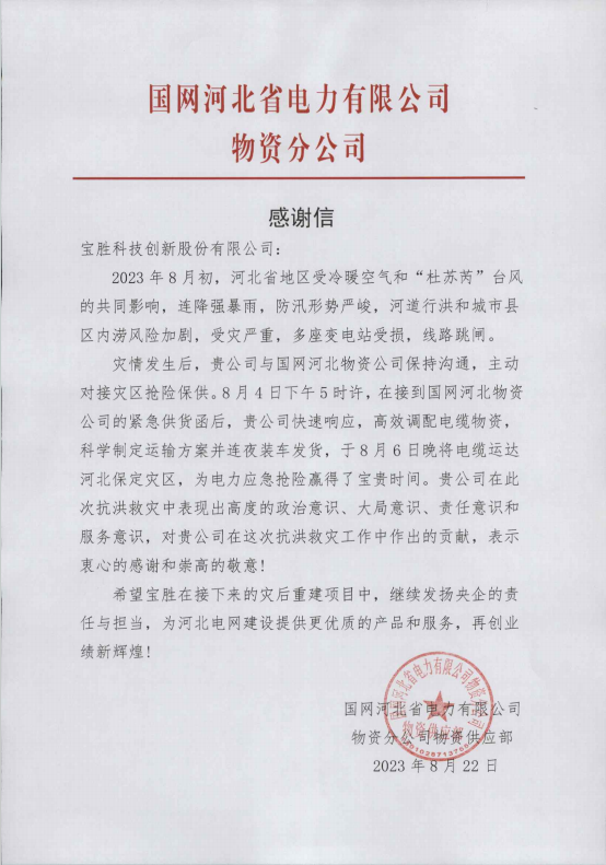 2023年8月22日,寶勝股份收到了國(guó)網(wǎng)河北省電力有限公司物資分公司發(fā)來(lái)的感謝信,對(duì)寶勝股份馳援河北災(zāi)區(qū)建設(shè)給予了充分肯定與高度贊揚(yáng)。