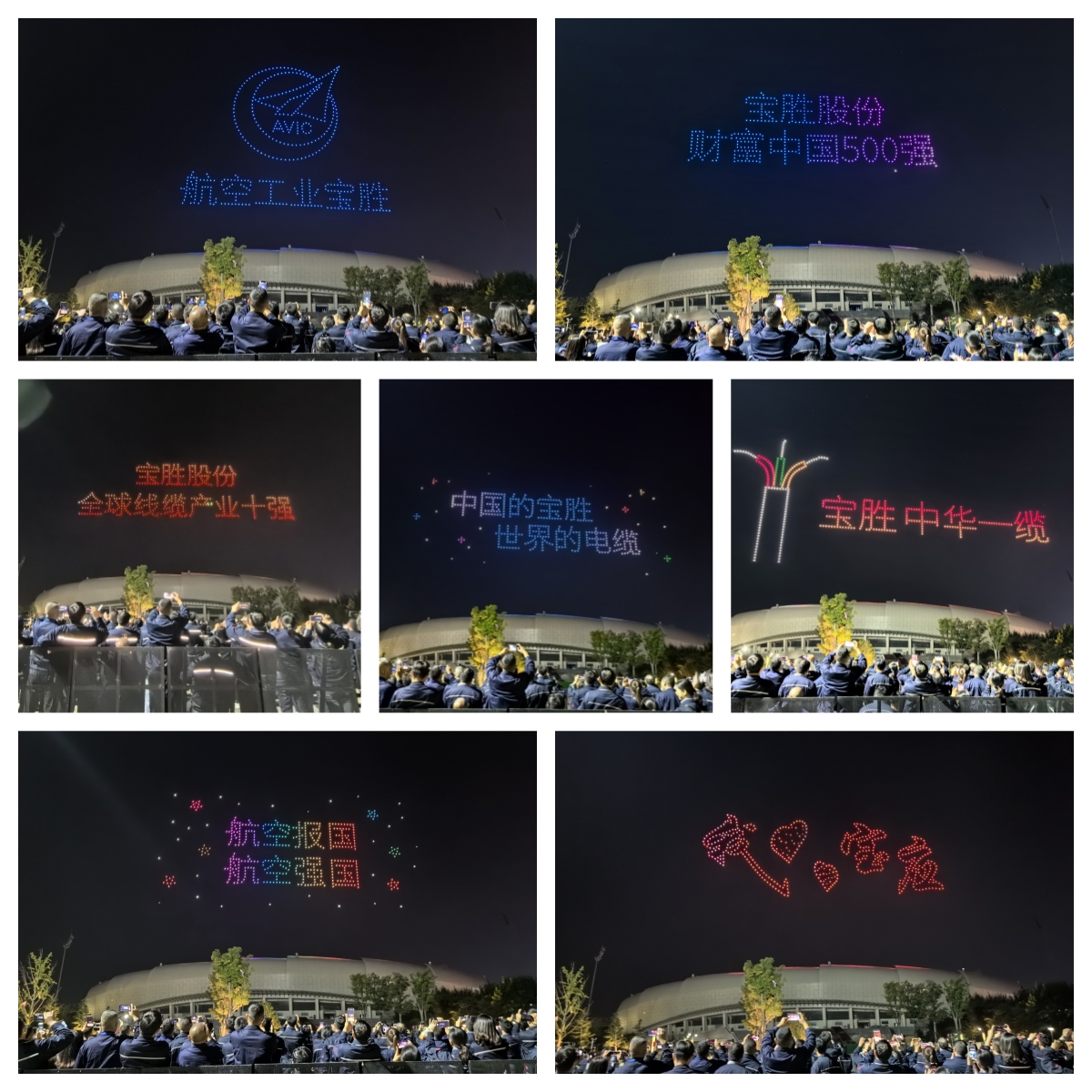 當晚18:58,無人機緩緩升空,城市靜謐的夜空瞬間被點亮,翹首以盼的寶勝職工頓時沸騰起來。無人機表演方陣如夜空中飛舞的精靈,穿梭于魅力星空變換出一幅幅靚麗多彩的畫面,與廣大市民共度郎朗秋夜,升空后的無人機開始變換陣形,在夜空繪就“航空工業寶勝”“寶勝股份 全球線纜產業十強”“寶勝股份 財富中國500強”“寶勝 中華一纜”“中國的寶勝 世界的電纜”“航空報國 航空強國”等字樣,航空工業司徽、電線電纜、五角星、荷藕等動畫圖案也隨之躍然夜空之中。最后壓軸的“我愛寶應”字樣在黑夜中閃爍,讓市民備受震撼和鼓舞。