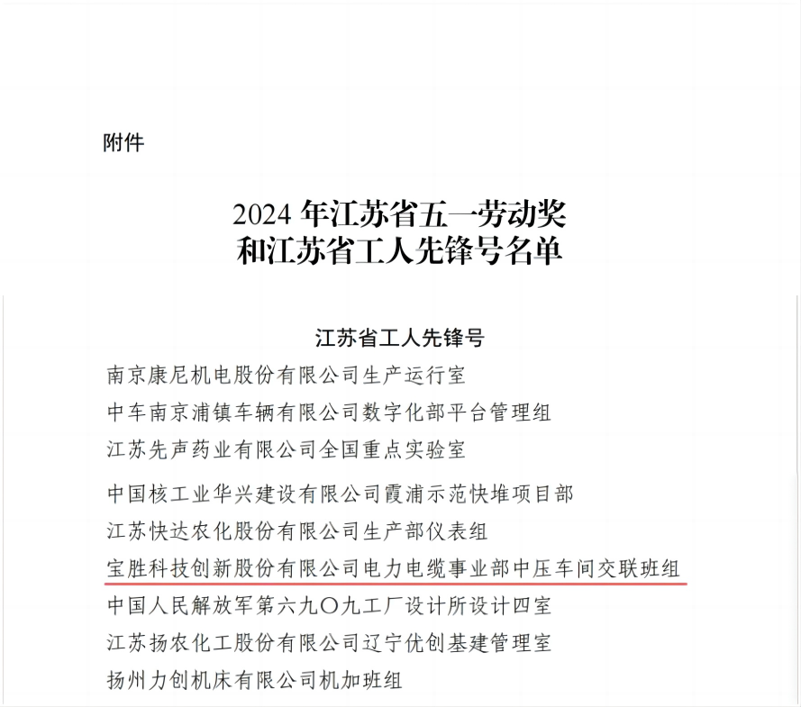 4月23日,省總工會下發關于表彰2024年省五一勞動獎和工人先鋒號的決定,寶勝科技創新股份有限公司電力電纜事業部中壓交聯班組榮獲“江蘇省工人先鋒號”稱號。
