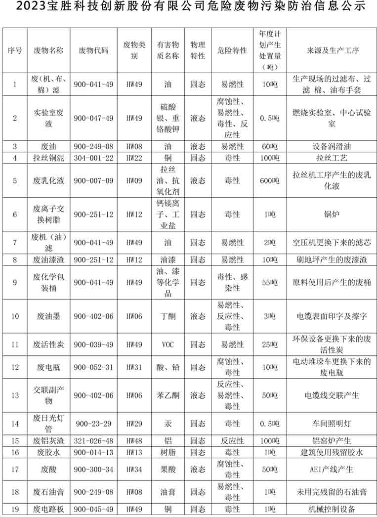 2023年寶勝危險廢物污染防治信息公示
