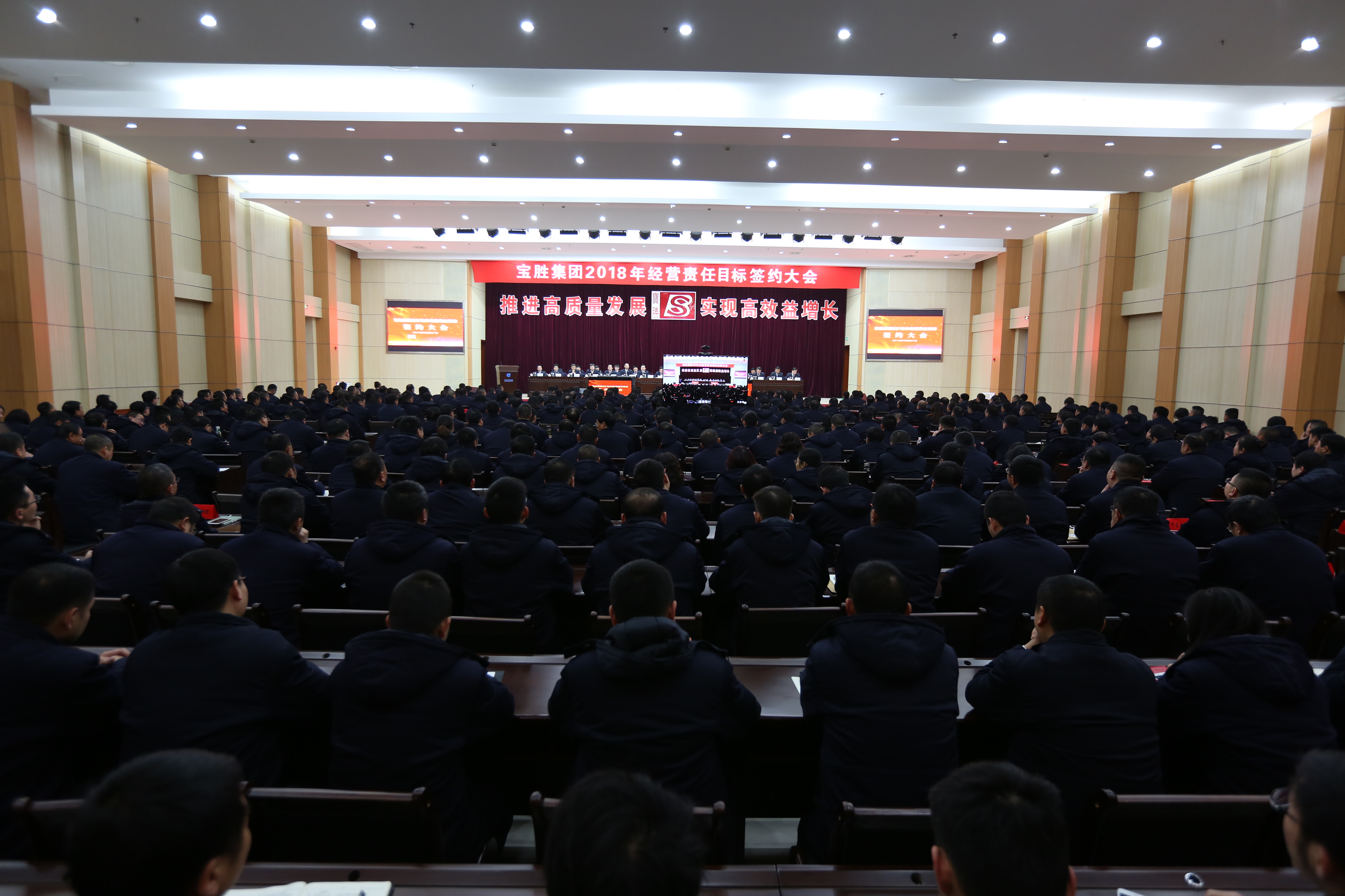2017年12月31日,2018年寶勝集團經營責任目標簽約大會在公司會議中心舉行,集團中層(含助理)以上管理人員、營銷公司總經理及副總經理、營銷人員、部分職工代表等近600人參加會議。公司高管、營銷大區負責人、區域總監、營銷公司總經理,以及子企業和職能部門負責簽訂了2018年經營責任目標責任狀。