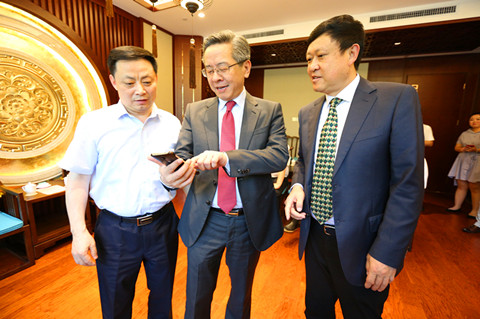 貴州省政府副省長盧雍政(中)、安順市副市長廖曉龍(右一)向寶勝集團董事長楊澤元(右三)介紹貴州